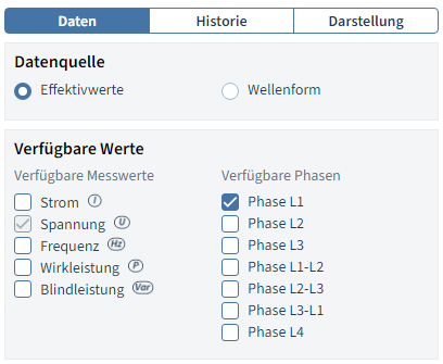 - Über die Registerkarten in der Seitenleiste öffnen Sie die Historie und passen die Darstellung des Messwerte-Graphen an.