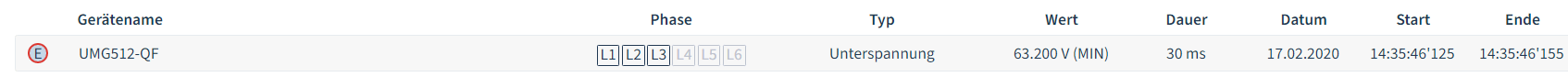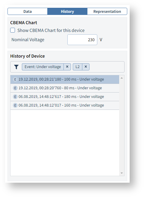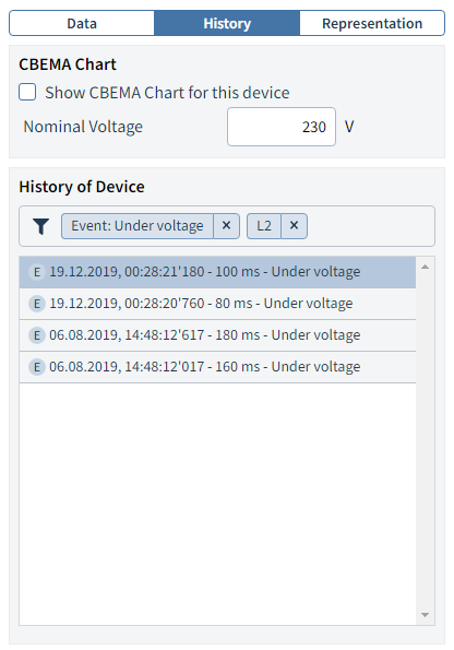 | 2 | Messwerte-Graph/CBEMA-Kurve: Im Messwert-Graph werden die zum Ereignis aufgezeichneten Messwerte dargestellt. Hier können Sie je nach Gerät und Konfiguration zwischen Effektivwert und Vollwelle wählen. Über die Gerätehistorie öffnen Sie einen gerätespezifischen CBEMA-Graphen. |