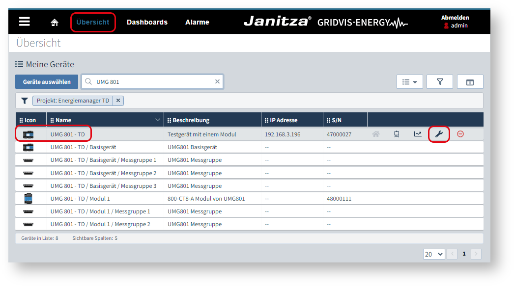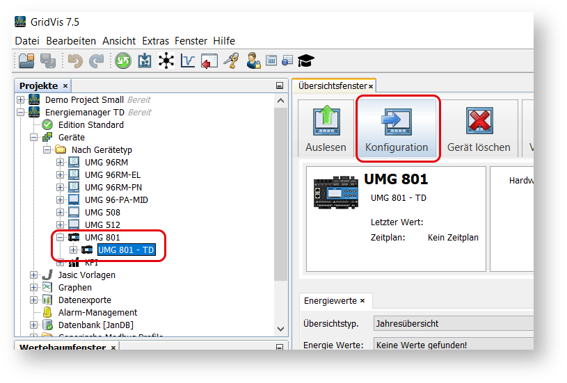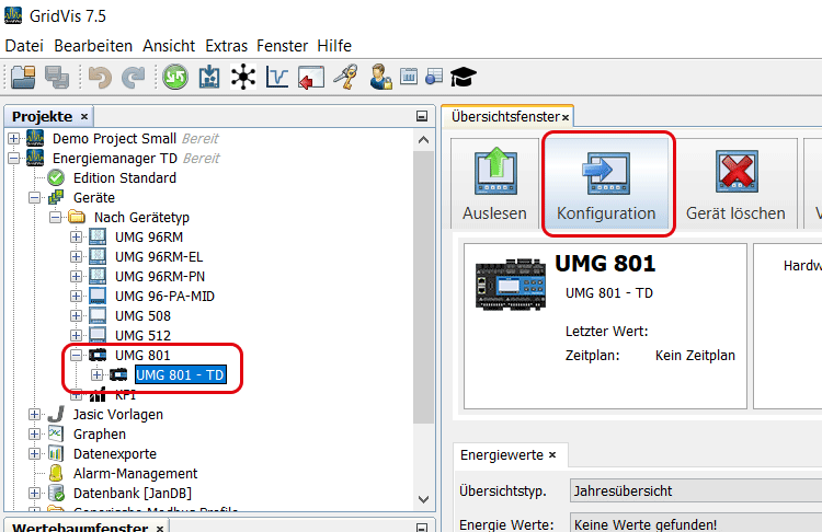 Legen Sie ein neues Gerät in der GridVis-Desktop an. Wählen Sie → UMG 801