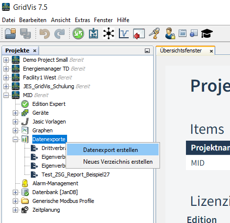 - Klicken Sie mit einem Rechtsklick auf das Verzeichnis Datenexport im Fenster Projekte und im erscheinenden Kontextmenü auf den Eintrag Datenexport erstellen.
