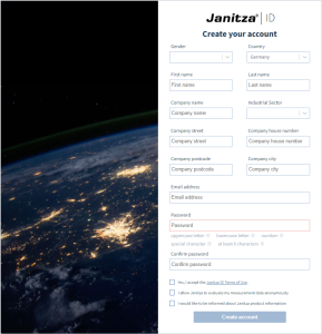The login to the GridVis® Cloud is done via a Janitza ID. If you do not have a Janitza ID yet, you can register here for free. If you are not yet logged in to the Janitza ID server with the browser you are currently using, a login dialog will first appear when you access the Web address of the GridVis® Cloud. You already have an online customer account:
