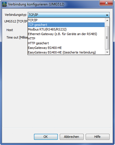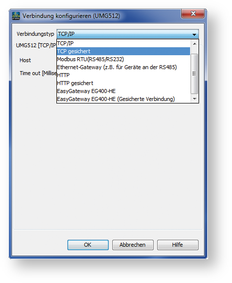 Wird das Messgerät in der GridVis eingerichtet, stehen mehrere Verbindungsprotokolle zur Verfügung. Ein Standard-Protokoll ist das Protokoll FTP – d. h. die GridVis liest Dateien vom Messgerät über den FTP-Port 21 mit den jeweiligen Daten-Ports 1024 bis 1027. In der Einstellung TCP/IP erfolgt die Verbindung ungesichert über FTP. Eine gesicherte Verbindung kann über die Verbindungsart TCP gesichert aufgebaut werden.