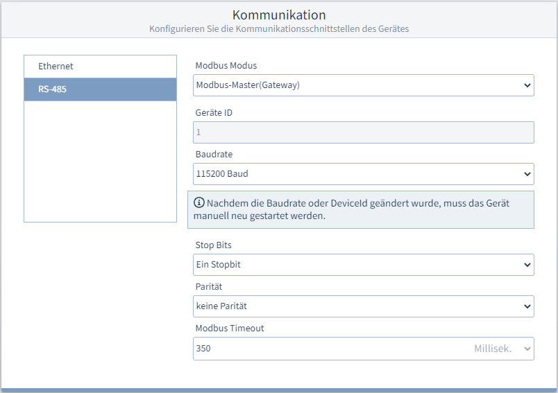 An das Gateway können über RS485 (Modbus RTU) mehrere Messgeräte oder andere Geräte angeschlossen sein. Im Modbus RTU agiert das Gateway als Client (alte Bezeichnung "Master"), das die Kommunikation initiiert. - Modbus-Slave: Dieses Messgerät ist als Server konfiguriert (alte Bezeichnung "Slave"), das auf die Anfragen des Gateways (Clients) reagiert.