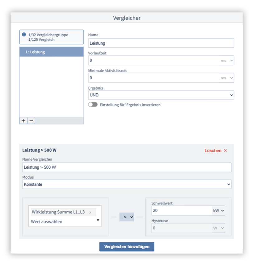 Vergleicher ermöglichen die Überwachung von Grenzwerten. Mehrere Vergleicher in einer Vergleichergruppe können mit UND- oder ODER-Verknüpfungen logisch miteinander verknüpft werden. Abhängig vom Ergebnis des Vergleichs kann zum Beispiel ein Digitalausgang für eine bestimmte Zeit geschaltet werden.